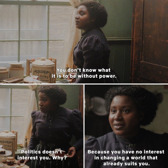 Enola Holmes is a perfect example of how to do it right. Throughout the story, the political reality is a backdrop and sometimes the focus. We get to see the reality of being a girl at a time when minors had no rights and women few. And even beloved characters don’t get to coast: Sherlock is called out for his neglect of politics, which could improve the plight of others.