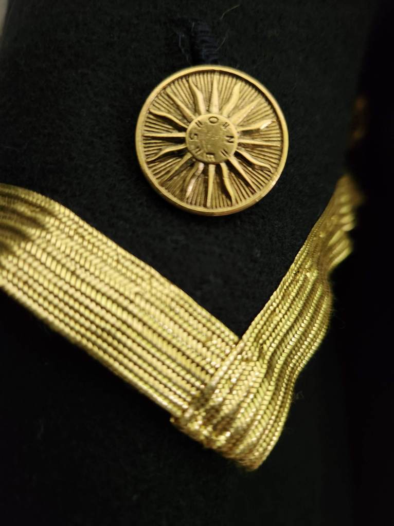 The traditional button for the Navy was an anchor, often fouled with a rope. Spaceships don’t need anchors; they stay conveniently in their orbits till you unfurl the sails. So I went looking for either a sun button (because solar ships are pushed by the sun) or a compass (because Martian Imperial Navy officers specialize in navigation). Jackpot–I found these gorgeous ones. They cost way more than an anchor button, but I had to have them. Like Lucy, I felt some pain over the amount that this thing cost. Luckily, I did not have to sell any racehorses to afford it–I just did a little extra at my job.