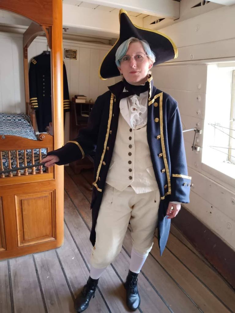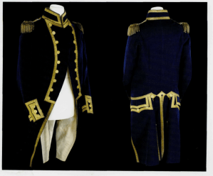 Lastly, the coat. The amount of gold braid and buttons was a hint to your rank. While I don’t have any pictures of extant midshipmen’s coats–I believe midshipmen would keep the same coat after promotion and just add more bling–I thought it made sense to use a bit less gold braid than I saw in the captains’ coats. I also omitted epaulets. The rules in the real Navy changed over the years, but I standardized them for my Navy: one epaulet for lieutenants, two for captains. Lucy, as a midshipman, has none.