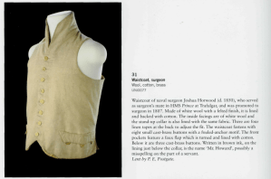 I altered the patterns significantly to match what I had seen in historical reference photos. The “uniform” of the British Royal Navy in the late 18th and early 19th century was not so formalized as uniforms are today. Instead of being issued your uniform, you’d have your tailor make a fairly standard gentleman’s suit, with specific details in color and trim decided by the Navy.